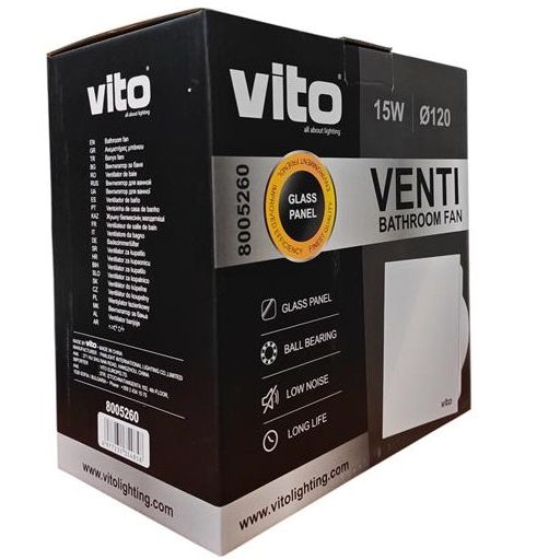 The Vito Venti-GL120 bathroom exhaust fan is an elegant and functional solution for ventilating bathrooms, toilets, and utility rooms. The flat white glass front panel gives it a modern and refined look, ideal for spaces where design matters. Thanks to its ball-bearing motor, it ensures long-lasting durability, reliable operation, and low noise levels, making it suitable for daily use on both walls and ceilings.