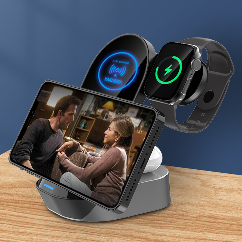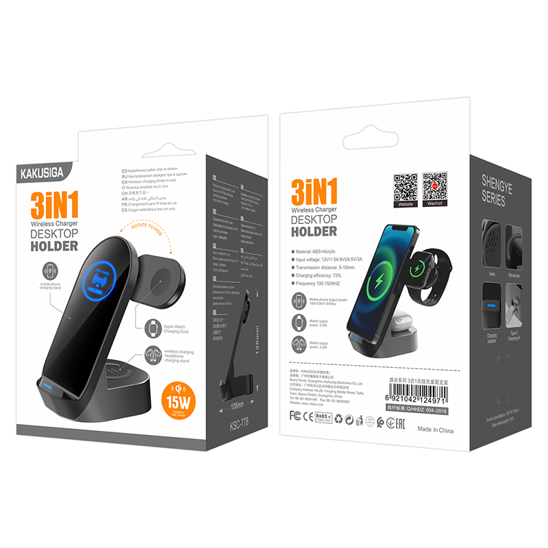 La stazione di ricarica wireless 3 in 1 KSC-778 è la soluzione ideale per mantenere in ordine e sempre pronti all’uso smartphone, smartwatch e auricolari compatibili con ricarica wireless. Grazie al suo design elegante e compatto, si adatta perfettamente a scrivanie, comodini e postazioni di lavoro, unendo praticità, stile e funzionalità in un unico accessorio.