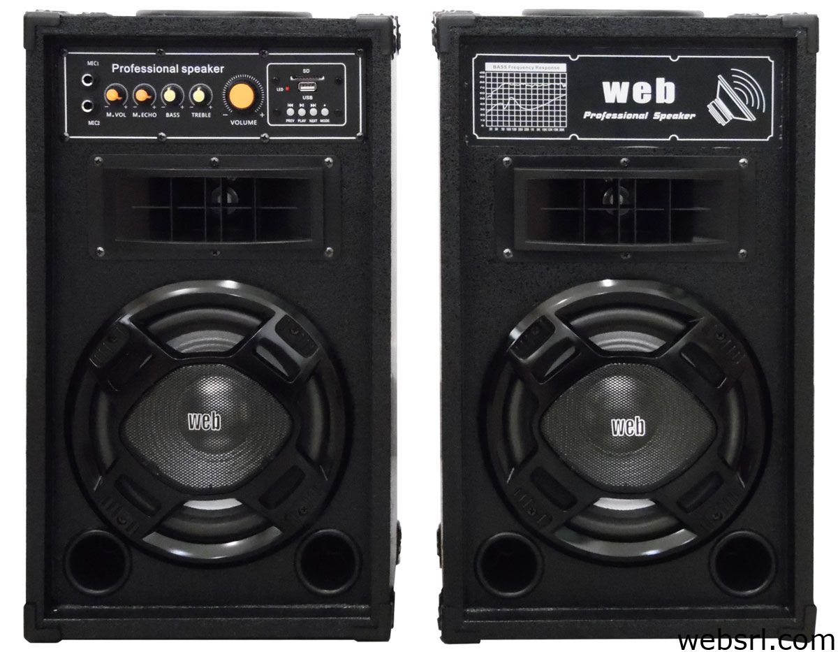 - La robusta estructura del par de altavoces, que consta de un marco de MDF y pr cticas asas en la parte superior, permite su transporte y uso incluso en exteriores < li> Conexiones de altavoz activo: 2 entradas jack de 6,3 mm para micr¢fono, 1 entrada USB, 1 entrada SD, 1 entrada RCA estreo