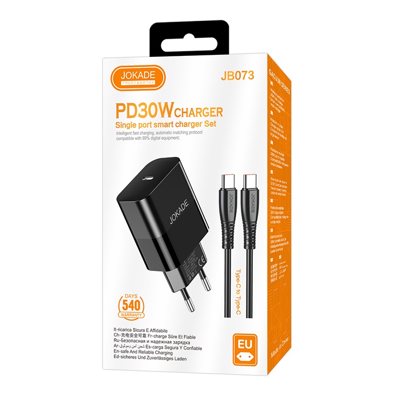 Set di ricarica compatto e versatile composto da caricatore da parete con porta USB-C e cavo Type-C to Type-C, pensato per offrire una ricarica rapida, stabile e sicura a smartphone, tablet e altri dispositivi compatibili. Il modello JB073 è una soluzione pratica per l’uso quotidiano, ideale a casa, in ufficio e in viaggio.